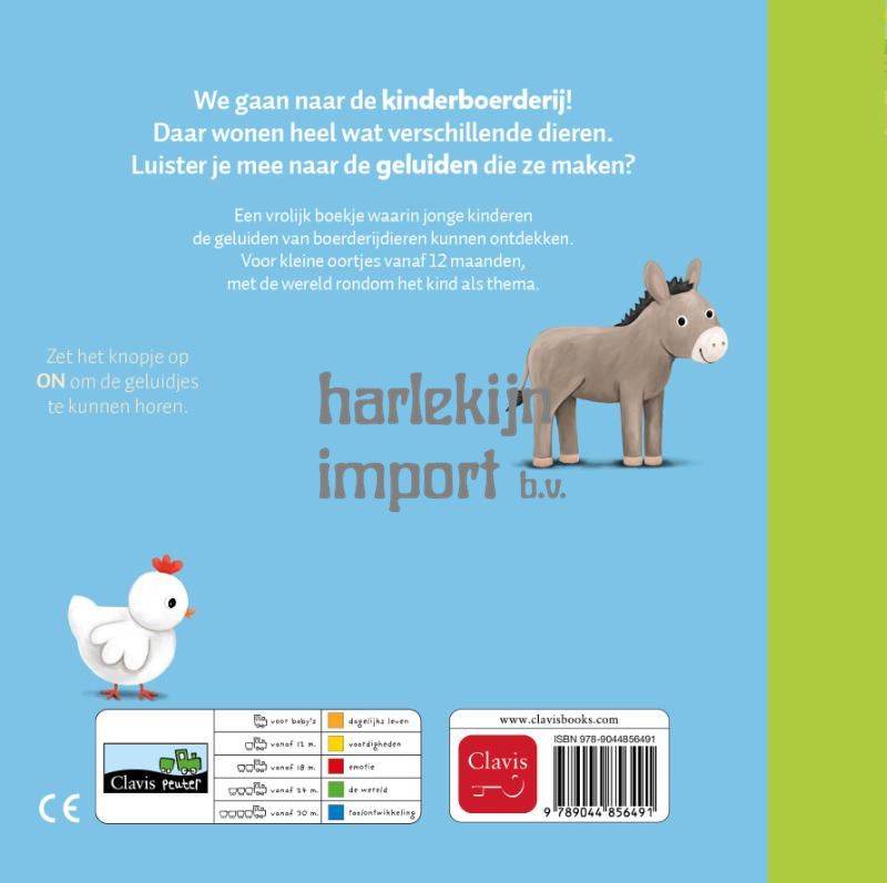 We gaan naar de kinderboerderij! Daar wonen heel wat verschillende dieren. Luister je mee naar de geluiden die ze maken? Een vrolijk boekje waarin jonge kinderen de geluiden van boerderijdieren kunnen ontdekken. Voor kleine oortjes vanaf 12 maanden, met de wereld rondom het kind als thema.