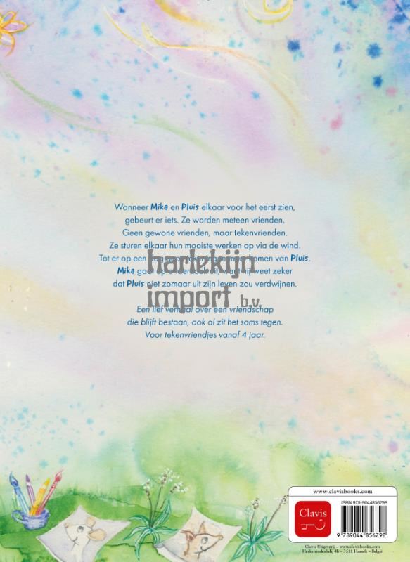 Wanneer Mika en Pluis elkaar voor het eerst zien, gebeurt er iets. Ze worden meteen vrienden. Geen gewone vrienden, maar tekenvrienden. Ze sturen elkaar hun mooiste werken op via de wind. Maar op een dag komen er geen tekeningen meer van Pluis. Mika gaat op onderzoek uit, want hij weet zeker dat Pluis niet zomaar uit zijn leven zou verdwijnen. Een lief verhaal over een vriendschap die blijft bestaan, ook al zit het soms tegen. Voor tekenvriendjes vanaf 4 jaar.