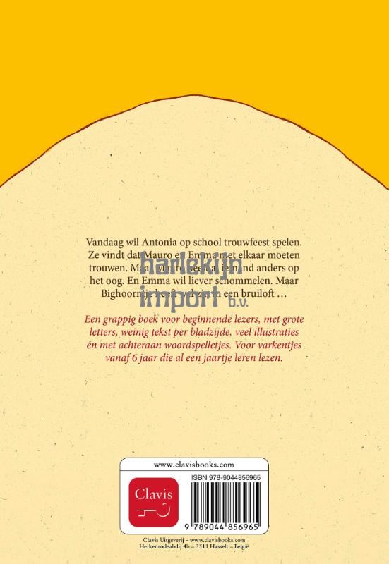 Vandaag wil Antonia op school trouwfeest spelen. Ze vindt dat Mauro en Emma met elkaar moeten trouwen. Maar Mauro heeft al iemand anders op het oog. En Emma wil liever schommelen. Maar Bighoorntje heeft wel zin in een bruiloft … Een grappig boek voor beginnende lezers, met grote letters, weinig tekst per bladzijde, veel illustraties én met achteraan woordspelletjes. Voor varkentjes vanaf 6 jaar die al een jaartje leren lezen.