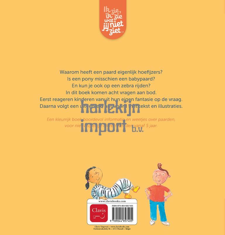 Waarom heeft een paard eigenlijk hoefijzers? Is een pony misschien een babypaard? En kun je ook op een zebra rijden? In dit boek komen acht vragen aan bod. Eerst reageren kinderen vanuit hun eigen fantasie op de vraag. Daarna volgt een uitgebreid antwoord met tekst en illustraties. Een kleurrijk boek boordevol informatie en weetjes over paarden, voor nieuwsgierige dierenvrienden vanaf 5 jaar.