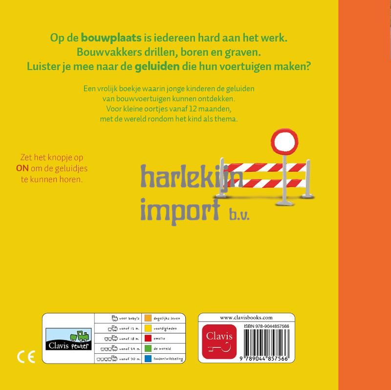 Op de bouwplaats is iedereen hard aan het werk. Bouwvakkers drillen, boren en graven. Luister je mee naar de geluiden die hun voertuigen maken? Een vrolijk boekje waarin jonge kinderen de geluiden van bouwvoertuigen kunnen ontdekken. Voor kleine oortjes vanaf 12 maanden, met de wereld rondom het kind als thema.