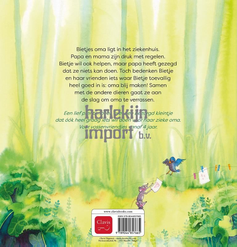 Bietjes oma ligt in het ziekenhuis. Papa en mama zijn druk met regelen. Bietje wil ook helpen, maar papa heeft gezegd dat ze niets kan doen. Toch bedenken Bietje en haar vrienden iets waar Bietje toevallig heel goed in is: oma blij maken! Samen met de andere dieren gaat ze aan de slag om oma te verrassen. Een lief prentenboek over een bezorgd kleintje dat óók heel graag iets wil doen voor haar zieke oma. Voor vossenvriendjes vanaf 4 jaar.
