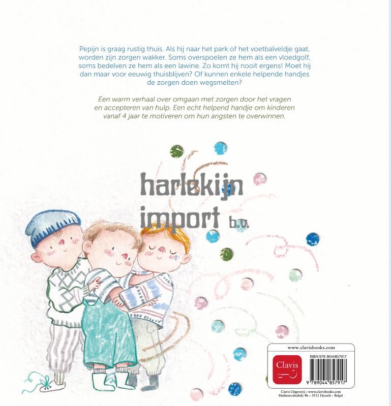 Pepijn is graag rustig thuis. Als hij naar het park of het voetbalveldje gaat, worden zijn zorgen wakker. Soms overspoelen ze hem als een vloedgolf, soms overrompelen ze hem als een lawine. Zo komt hij nooit ergens! Moet hij dan maar voor eeuwig thuisblijven? Of kunnen enkele helpende handjes de zorgen doen wegsmelten? Een warm verhaal over omgaan met zorgen door het vragen en accepteren van hulp. Een echt helpend handje om kinderen vanaf 4 jaar te motiveren om hun angsten te overwinnen.