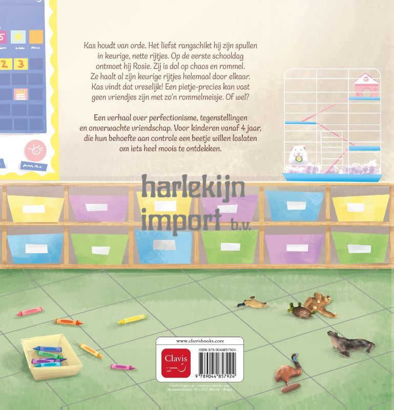 Kas houdt van orde. Het liefst rangschikt hij zijn spullen in keurige, nette rijtjes. Op de eerste schooldag ontmoet hij Rosie. Zij is dol op chaos en rommel. Ze haalt al zijn keurige rijtjes helemaal door elkaar. Kas vindt dat vreselijk! Een pietje-precies kan vast geen vriendjes zijn met zo’n rommelmeisje. Of wel? Een verhaal over perfectionisme, tegenstellingen en onverwachte vriendschap. Voor kinderen vanaf 4 jaar, die hun behoefte aan controle een beetje willen loslaten om iets heel moois te ontdekken.