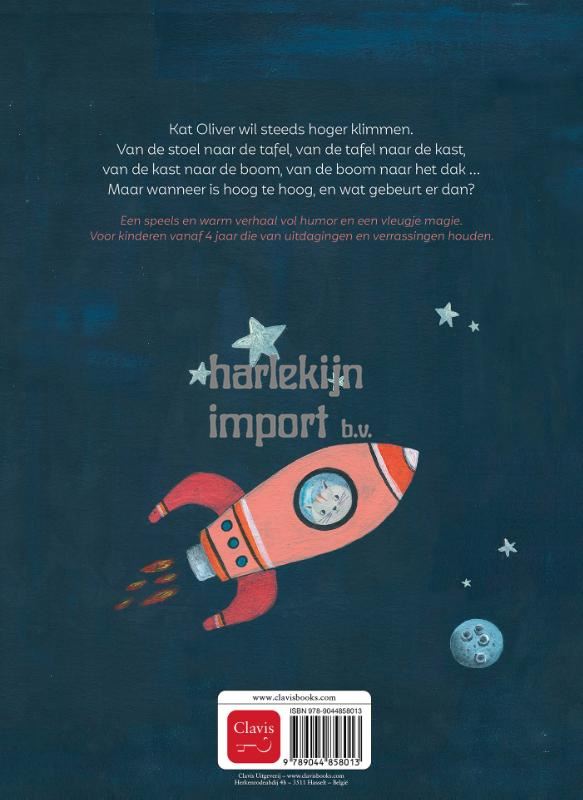 Kat Oliver wil steeds hoger klimmen. Van de stoel naar de tafel, van de tafel naar de kast, van de kast naar de boom, van de boom naar het dak … Maar wanneer is hoog te hoog, en wat gebeurt er dan? Een speels en warm verhaal vol humor en een vleugje magie. Voor kinderen vanaf 4 jaar die van uitdagingen en verrassingen houden.
