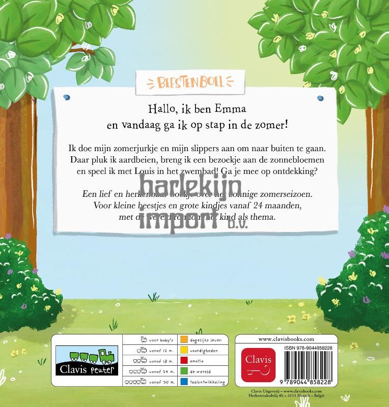 Hallo, ik ben Emma en vandaag ga ik op stap in de zomer! Ik doe mijn zomerjurkje en mijn teenslippers aan om naar buiten te gaan. Daar pluk ik verse aardbeien, breng ik een bezoekje aan de zonnebloemen en speel ik met Louis in het zwembad! Ga je mee op ontdekking? Een lief en herkenbaar boekje over het zonnige zomerseizoen. Voor kleine beestjes en grote kindjes vanaf 24 maanden, met de wereld rondom het kind als thema.