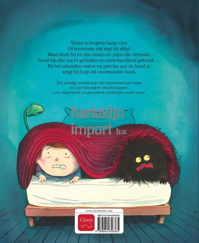 Victor is nergens bang voor. Of tenminste, dat zegt hij altijd. Maar sinds hij en zijn mama en papa zijn verhuisd, hoort hij elke nacht gefluister en onheilspellend gekraak … Bij het uitzoeken wat er nu precies aan de hand is, krijgt hij hulp uit onverwachte hoek … Een schattig verhaal over het overwinnen van angst en over bijzondere vriendschappen, voor beginnende en gevorderde durfalletjes vanaf 5 jaar.