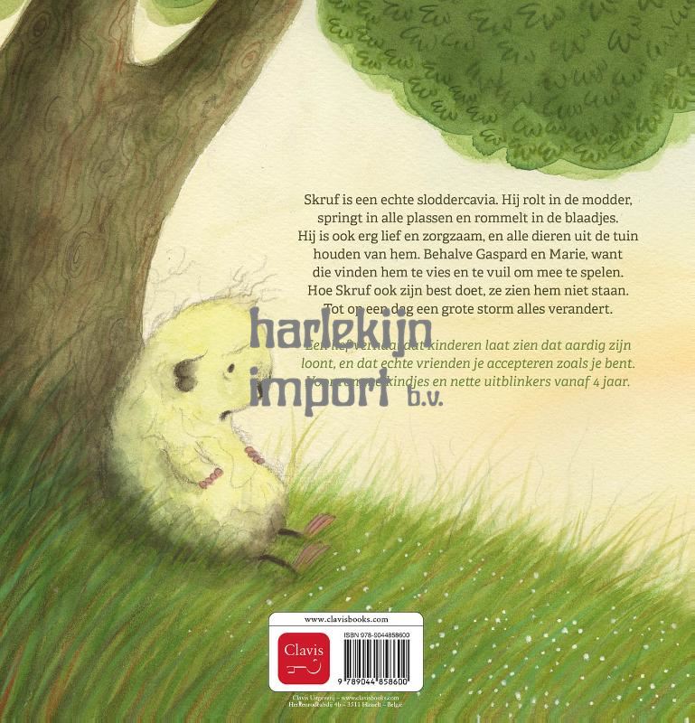 Skruf is een echte sloddercavia. Hij rolt in de modder, springt in alle plassen en rommelt in de blaadjes. Hij is ook erg lief en zorgzaam, en alle dieren uit de tuin houden van hem. Behalve Gaspard en Marie, want die vinden hem te vies en te vuil om mee te spelen. Hoe Skruf ook zijn best doet, ze zien hem niet staan. Tot op een dag een grote storm alles verandert. Een lief verhaal dat kinderen laat zien dat aardig zijn loont, en dat echte vrienden je accepteren zoals je bent. Voor rommelkindjes en nette uitblinkers vanaf 4 jaar.