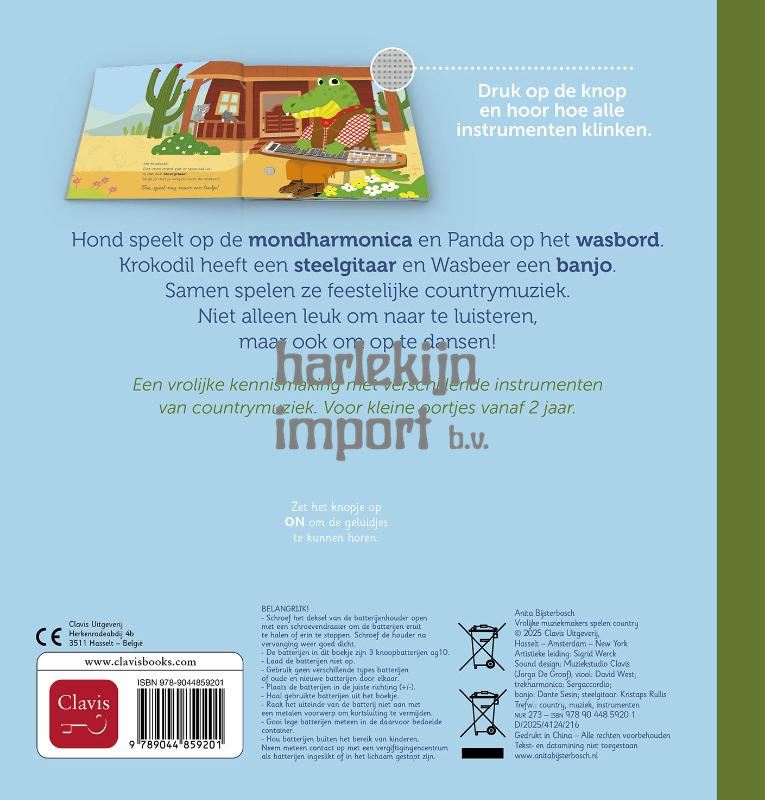 Hond speelt op de mondharmonica en Panda op het wasbord. Krokodil heeft een steelgitaar en Wasbeer een banjo. Samen spelen ze feestelijke countrymuziek. Niet alleen leuk om naar te luisteren, maar ook om op te dansen! Een vrolijke kennismaking met verschillende instrumenten van countrymuziek. Voor kleine oortjes vanaf 2 jaar.