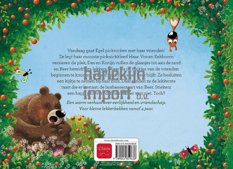 Vandaag gaat Egel picknicken met haar vrienden! Ze legt haar mooiste picknickkleed klaar. Vos en Eekhoorn versieren de plek, Das en Konijn vullen de glaasjes tot aan de rand en Beer bereidt iets lekkers. Maar als de buikjes van de vrienden beginnen te knorren, vragen ze zich af waar Beer blijft. Ze besluiten een kijkje te nemen bij haar huis. Daar vinden ze de lekkerste taart die er bestaat: de bosbessentaart van Beer. Stiekem een hapje proeven, dat merkt Beer vast niet. Toch? Een warm verhaal over eerlijkheid en vriendschap. Voor kleine lekkerbekken vanaf 4 jaar.