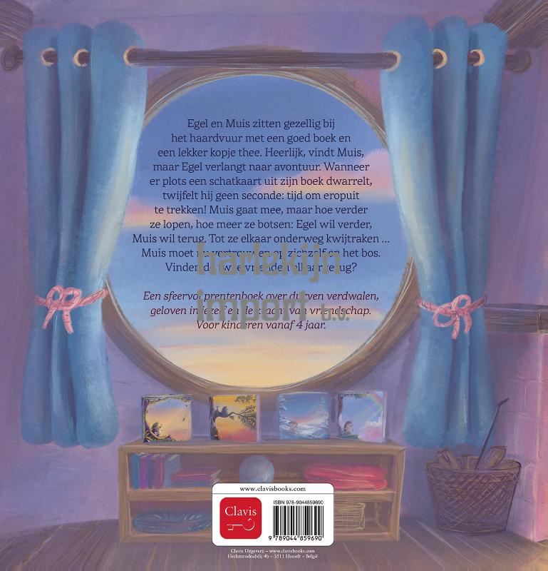 Egel en Muis zitten gezellig bij het haardvuur met een goed boek en een lekker kopje thee. Heerlijk, vindt Muis, maar Egel verlangt naar avontuur. Wanneer er plots een schatkaart uit zijn boek dwarrelt, twijfelt hij geen seconde: tijd om eropuit te trekken! Muis gaat mee, maar hoe verder ze lopen, hoe meer ze botsen: Egel wil verder, Muis wil terug. Tot ze elkaar onderweg kwijtraken … Muis moet nu vertrouwen op zichzelf en het bos. Vinden de twee vrienden elkaar terug? Een sfeervol prentenboek over durven verdwalen, geloven in jezelf en de kracht van vriendschap.