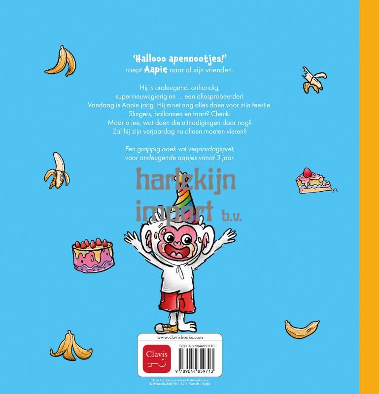 ‘Hallooo apennootjes!’ roept Aapie naar al zijn vrienden. Hij is … ondeugend, onhandig, supernieuwsgierig en … een allesprobeerder! Vandaag is Aapie jarig. Hij moet nog alles doen voor zijn feestje. Slingers, ballonnen en taart? Check! Maar o jee, wat doen die uitnodigingen daar nog? Zal hij zijn verjaardag nu alleen moeten vieren? Een grappig boek vol verjaardagspret, voor ondeugende aapjes vanaf 3 jaar.