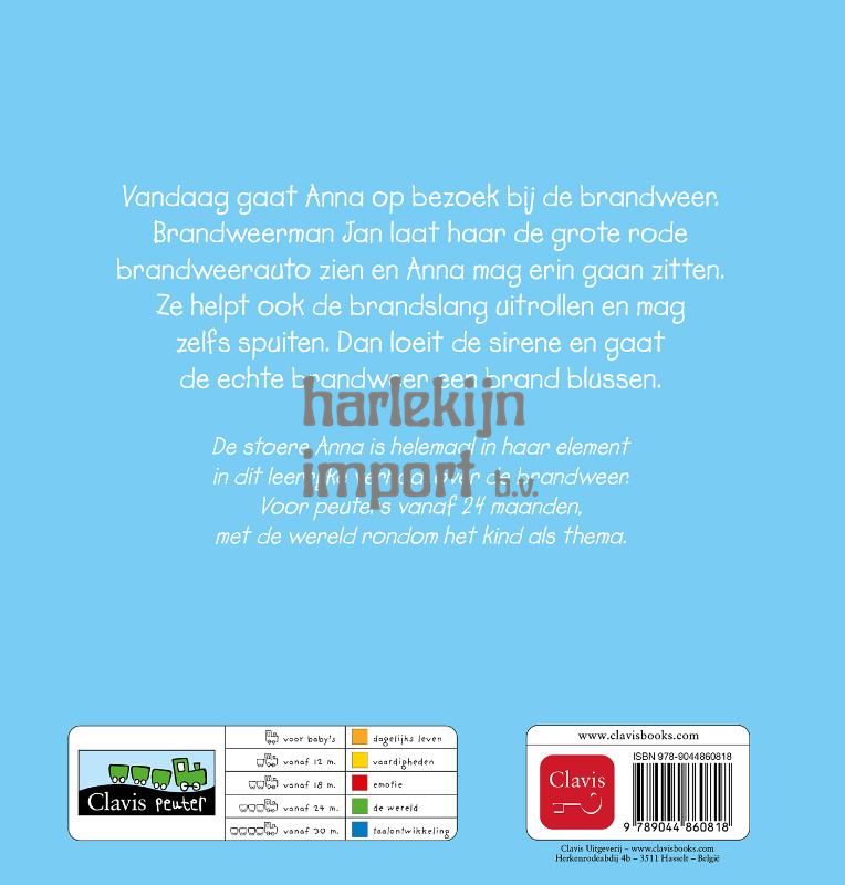 Vandaag gaat Anna op bezoek bij de brandweer. Brandweerman Jan laat haar de grote rode brandweerauto zien en Anna mag erin gaan zitten. Ze helpt ook de brandslag uitrollen en mag zelfs spuiten. Dan loeit de sirene en gaat de echte brandweer een brand blussen. De stoere Anna is helemaal in haar element in dit leerrijke verhaal over de brandweer. Voor peuters vanaf 24 maanden, met de wereld rondom het kind als thema.