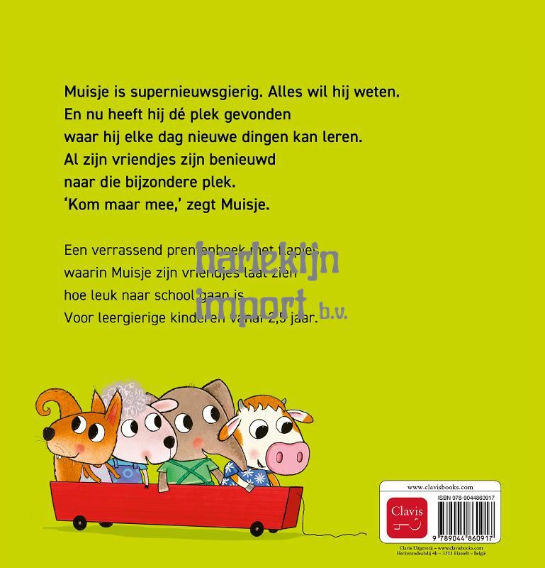 Muisje is supernieuwsgierig. Alles wil hij weten. En nu heeft hij dé plek gevonden waar hij elke dag nieuwe dingen kan leren. Al zijn vriendjes zijn benieuwd naar die bijzondere plek. ‘Kom maar mee,’ zegt Muisje. Een verrassend prentenboek met flapjes, waarin Muisje zijn vriendjes laat zien hoe leuk naar school gaan is. Voor leergierige kinderen vanaf 2,5 jaar.
