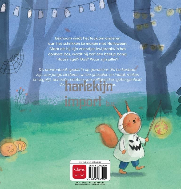 Eekhoorn vindt het leuk om anderen aan het schrikken te maken met Halloween. Maar als hij zijn vriendjes kwijtraakt in het donkere bos, wordt hij zelf een beetje bang. ‘Haas? Egel? Das? Waar zijn jullie?’ Dit prentenboek speelt in op gevoelens die herkenbaar zijn voor jonge kinderen: willen griezelen en indruk maken en tegelijk behoefte hebben aan veiligheid en geborgenheid. Voor lieve spookjes vanaf 4 jaar.