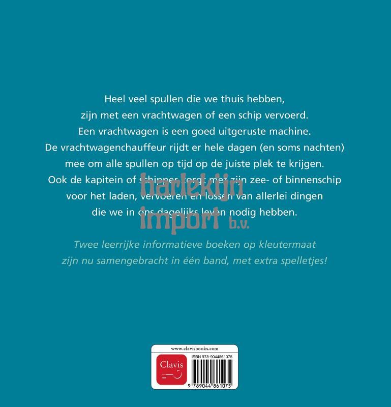 Heel veel spullen die we thuis hebben, zijn met een vrachtwagen of een schip vervoerd. Een vrachtwagen is een goed uitgeruste machine. De vrachtwagenchauffeur rijdt er hele dagen (en soms nachten) mee om alle spullen op tijd op de juiste plek te krijgen. Ook de kapitein of schipper zorgt met zijn zee- of binnenschip voor het laden, vervoeren en lossen van allerlei dingen die we in ons dagelijks leven nodig hebben. Twee leerrijke informatieve boeken op kleutermaat zijn nu samengebracht in één band, met extra spelletjes!