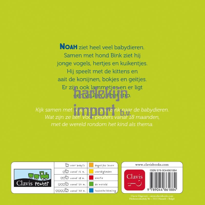 Noah ziet heel veel babydieren. Samen met hond Bink ziet hij jonge vogels, hertjes en kuikentjes. Hij speelt met de kittens en aait de konijnen, bokjes en geitjes. Er zijn ook lammetjes en er ligt een veulen in het hooi. Kijk samen met Noah en hond Bink naar de babydieren. Wat zijn ze lief! Voor peuters vanaf 18 maanden, met de wereld rondom het kind als thema.