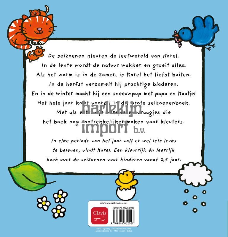 De seizoenen kleuren de leefwereld van Karel. In de lente wordt de natuur wakker en groeit alles. Als het warm is in de zomer, is Karel het liefst buiten. In de herfst verzamelt hij prachtige bladeren. En in de winter maakt hij een sneeuwpop met papa en Kaatje! Het hele jaar komt voorbij in dit grote seizoenenboek. Met als extraatje versjes en vraagjes die het boek nog aantrekkelijker maken voor kleuters. In elke periode van het jaar valt er wel iets leuks te beleven, vindt Karel. Een kleurrijk én leerrijk boek over de seizoenen voor kinderen vanaf 2,5 jaar.