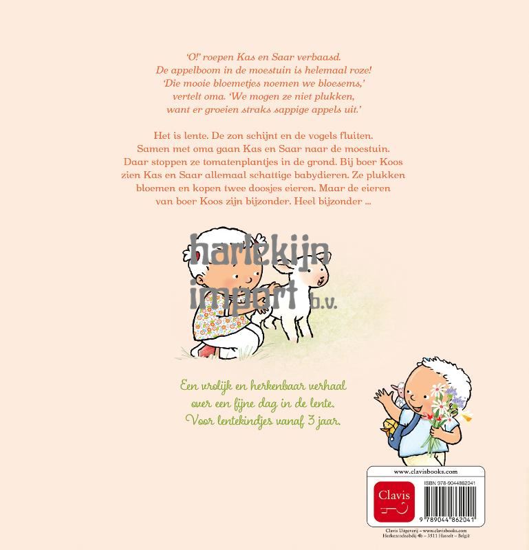 ‘O!’ roepen Kas en Saar verbaasd. De appelboom in de moestuin is helemaal roze! ‘Die mooie bloemetjes noemen we bloesems,’ vertelt oma. ‘We mogen ze niet plukken, want er groeien straks sappige appels uit.’ Het is lente. De zon schijnt en de vogels fluiten. Samen met oma gaan Kas en Saar naar de moestuin. Daar stoppen ze tomatenplantjes in de grond. Bij boer Koos zien Kas en Saar allemaal schattige babydieren. Ze kopen eieren en plukken mooie bloemen. Maar de eieren van boer Koos zijn bijzonder. Heel bijzonder … Een vrolijk en herkenbaar verhaal over een fijne dag in de lente. Voor lentekindjes vanaf 3 jaar.