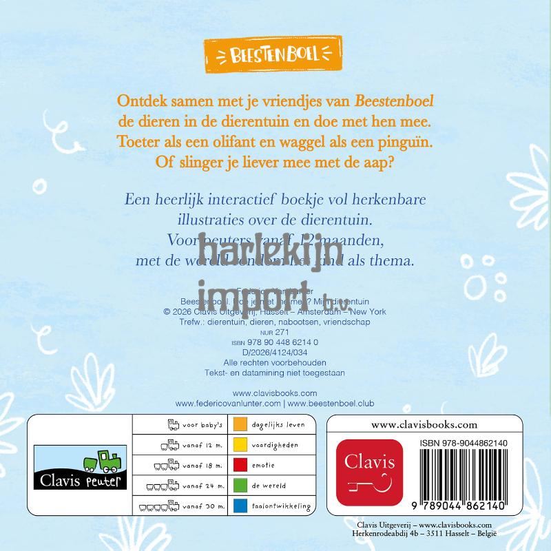 Ontdek samen met je vriendjes van Beestenboel de dieren in de dierentuin en doe met hen mee. Toeter als een olifant en waggel als een pinguïn. Of slinger je liever mee met de aap? Een heerlijk interactief boekje vol herkenbare illustraties over de dierentuin. Voor peuters vanaf 12 maanden, met de wereld rondom het kind als thema.