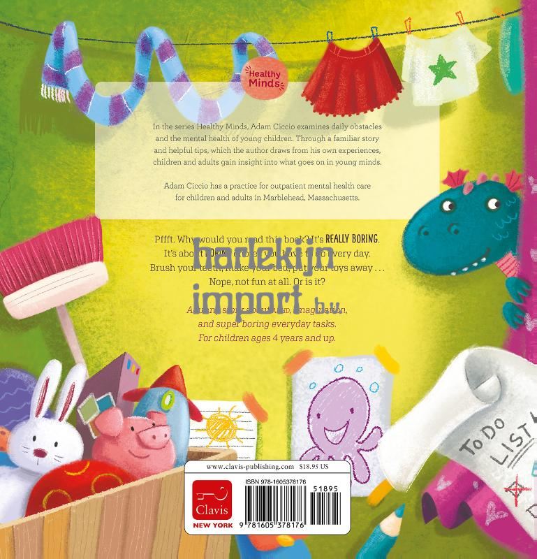 In the series Healthy Minds, Adam Ciccio examines daily obstacles and the mental health of young children. Through a familiar story and helpful tips, which the author draws from his own experiences, children and adults gain insight into what goes on in young minds. Adam Ciccio has a practice for outpatient mental health care for children and adults in Marblehead, Massachusetts. Pffft. Why would you read this book? It’s REALLY BORING. It’s about BORING chores you have to do every day. Brush your teeth, make your bed, put your toys away . . . Nope, not fun at all. Or is it? A funny story about ADHD, imagination, and super boring everyday tasks. For children ages 4 years and up.