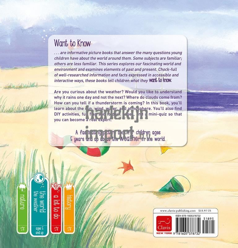 Want to know . . . are informative picture books that answer the questions of young children. Some subjects are familiar to them, others are less familiar. The books deal with the world and the environment around us, with our past and our present. In a playful and clever way, these books tell children what they want to know. Are you curious about the weather? Would you like to understand why it rains one day and not the next? Where do clouds come from? How can you tell if a thunderstorm is coming? In this book, you’ll learn about the sun, wind, water, and atmosphere. You’ll also learn silly weather phrases and their meanings. This book contains DIY activities and a mini-quiz, so you’ll become a real weather expert! An instructive picture book for children ages 5 years and up about the weather in the world.