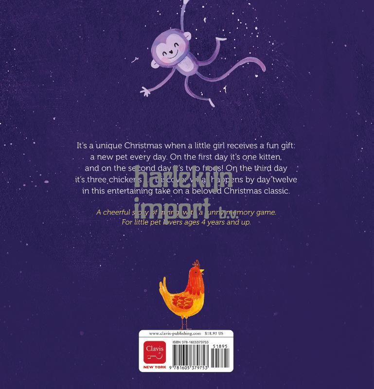 It’s a unique Christmas when a little girl receives a fun gift: a new pet every day. On the first day it’s one kitten, and on the second day it’s two frogs! On the third day it’s three chickens . . . Discover what happens by day twelve in this entertaining take on a beloved Christmas classic. A cheerful story of giving with a funny memory game. For little pet lovers ages 4 years and up.