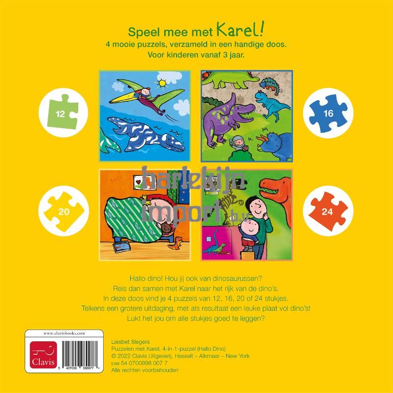 Speel mee met Karel! 4 mooie puzzels, verzameld in een handige doos. Voor kinderen vanaf 3 jaar. Hallo Dino! Hou jij ook van dinosaurussen? Reis dan samen met Karel naar het rijk van de dino’s. In deze doos vind je 4 puzzels van 12, 16, 20 of 24 stukjes. Telkens een grotere uitdaging, met als resultaat een leuke plaat vol dino’s! Lukt het jou om alle stukjes goed te leggen?