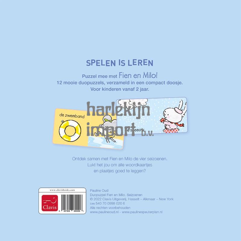 Puzzel mee met Fien en Milo! 12 mooie duopuzzels, verzameld in een compact doosje. Voor kinderen vanaf 2 jaar. Ontdek samen met Fien en Milo de vier seizoenen. Lukt het jou om alle woordkaartjes en plaatjes goed te leggen?