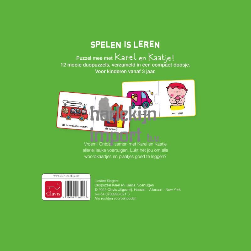 Puzzel mee met Karel en Kaatje! 12 mooie duopuzzels, verzameld in een compact doosje. Voor kinderen vanaf 3 jaar. Vroem! Ontdek samen met Karel en Kaatje allerlei leuke voertuigen. Lukt het jou om alle woordkaartjes en plaatjes goed te leggen?
