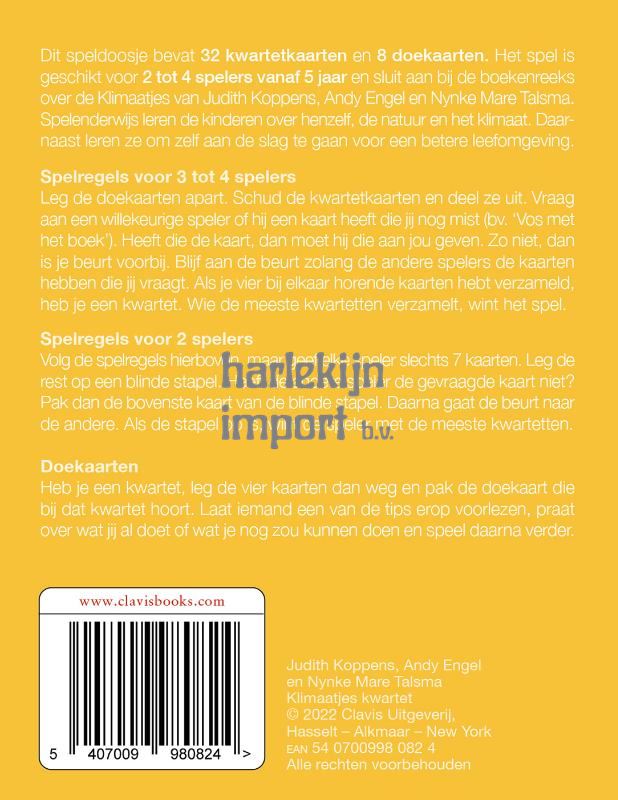 Dit speldoosje bevat 32 kwartetkaarten en 8 doekaarten. Het spel is geschikt voor 2 tot 4 spelers vanaf 5 jaar en sluit aan bij de boekenreeks over de Klimaatjes van Judith Koppens, Andy Engel en Nynke Mare Talsma. Spelenderwijs leren de kinderen over henzelf, de natuur en het klimaat. Daarnaast leren ze om zelf aan de slag te gaan voor een betere leefomgeving.