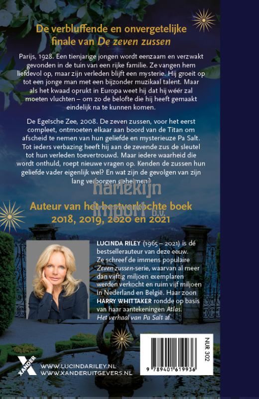 Atlas, het achtste en laatste deel in de Zeven zussen-serie van Lucinda Riley, vertelt het verhaal van Pa Salt en begint in Parijs, 1928. Een voor dood achtergelaten jongen wordt in huis gehaald door een liefdevolle familie. Daar bloeit hij volledig op, maar het blijft een mysterie wie hij écht is. De jongen weigert een woord los te laten over zijn verleden. Net als hij de ellende waarvoor hij is gevlucht bijna is vergeten – evenals de belofte die hij heeft gezworen na te komen – rukt het kwaad op in Europa en weet hij dat hij weer zal moeten vluchten. De Egeïsche zee, 2008. De zeven zussen, voor het eerst compleet, ontmoeten elkaar aan boord van de Titan om afscheid te nemen van hun geliefde Pa Salt. Tot ieders verbazing heeft hij aan de zevende zus de sleutel van hun verleden toevertrouwd – maar iedere waarheid die wordt onthuld, roept nieuwe vragen op. Kenden de zussen hun geliefde vader eigenlijk wel? En wat zijn de gevolgen van zijn lang verborgen geheimen? Atlas. Het verhaal van Pa Salt, het achtste deel in de immens populaire serie van Lucinda Riley over liefde, verlies en de zoektocht naar wie je werkelijk bent, brengt de Zeven zussen-reeks tot een prachtig en onvergetelijk einde. Deze luxe uitvoering is prachtig uitgevoerd: gebonden, met gouden folieletters. ‘Een verslavende serie. Een zoektocht naar liefde en identiteit vol exotische locaties, glamour en mystiek. Heerlijk!’ – Margriet ‘Leest als een trein.’ – Libelle