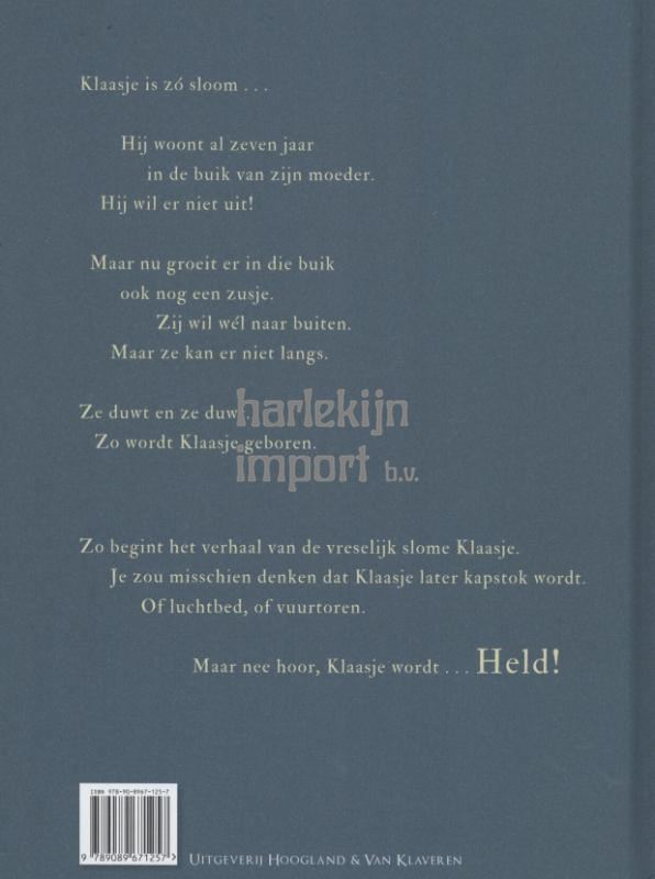 Klaasje is zó sloom... Hij woont al zeven jaar in de buik van zijn moeder. Hij wil er niet uit! Maar nu groeit er in die buik ook nog een zusje. Zij wil wél naar buiten. Maar ze kan er niet langs. Ze duwt en ze duwt... Zo wordt Klaasje geboren.