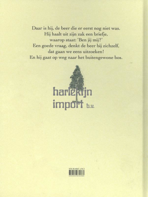 Daar is hij, de beer die er eerst nog niet was. Hij haalt uit zijn zak een briefje, waar- op staat: ‘Ben jij mij?’ Een goede vraag, denkt de beer bij zichzelf, dat gaan we eens uitzoeken! En hij gaat op weg naar het buitengewone bos.