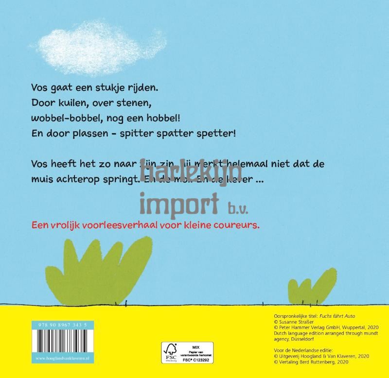 Vos gaat een stukje rijden. Door kuilen, over stenen, wobbel-bobbel, nog een hobbel! En door plassen - spitter spatter spetter! Vos heeft het zo naar zijn zin, hij merkt helemaal niet dat de muis achterop springt. En de mol. En de kever ... Een vrolijk voorleesverhaal voor kleine coureurs.
