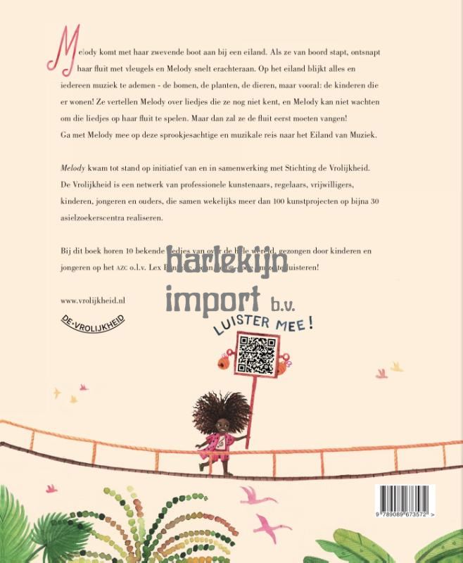 Het meisje Melody komt met haar zwevende boot aan bij een eiland. Haar gevleugelde fluit heeft haar de weg gewezen. Op het eiland blijkt alles en iedereen muziek te ademen: de bomen, de planten, de dieren, maar vooral: de kinderen die er wonen! Melody hoort liedjes in allerlei talen die ze niet kent, maar de taal van de muziek blijkt voor iedereen verstaanbaar. En Melody wil die liedjes maar wat graag leren ... Ga met Melody mee op deze sprookjesachtige en muzikale reis door alle windstreken.