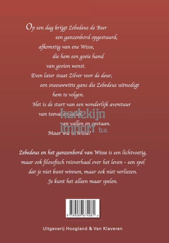 Op een dag krijgt Zebedeus de Beer een ganzenbord opgestuurd, afkomstig van ene Wisse, die hem een goeie hand van gooien wenst. Even later staat Zilver voor de deur, een sneeuwwitte gans die Zebedeus uitnodigt hem te volgen. Het is de start van een wonderlijk avontuur van toeval en geluk, van vallen en opstaan. Maar wie is Wisse? 'Zebedeus en het ganzenbord van Wisse' is een lichtvoetig, maar ook filosofisch reisverhaal over het leven – een spel dat je niet kunt winnen, maar ook niet verliezen. Je kunt het alleen maar spelen.