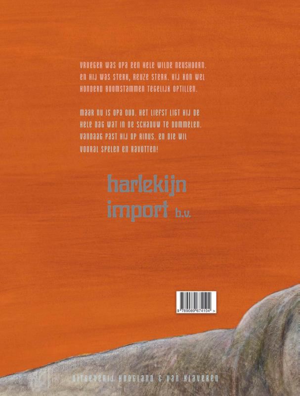 Vroeger was opa een hele wilde neushoorn. En hij was sterk, reuze sterk. Hij kon wel honderd boomstammen tegelijk optillen. Maar nu is opa oud. Het liefst ligt hij de hele dag wat in de schaduw te dommelen. Vandaag past hij op Rinus. En die wil vooral spelen en ravotten!