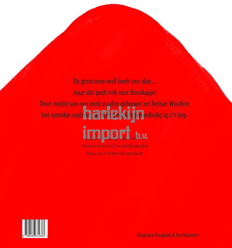 De grote boze wolf heeft een plan ... maar dat heeft Roodkapje ook! Door middel van een sterk staaltje girlpower zet Bethan Woollvin het sprookje zoals we dat tot nu toe kenden volledig op z’n kop. Op weg naar het huisje van grootmoeder komt Roodkapje een wolf tegen. Dat zouden sommige kleine meisjes misschien eng vinden, maar dit kleine meisje niet. Ze weet precies wat de wolf van plan is, en ze zal ervoor zorgen dat hij er niet mee wegkomt! Winnaar van de Macmillan Children’s Book Prize Uitgeroepen tot New York Times Best Illustrated Book Winnaar van de AOI World Illustration Awards