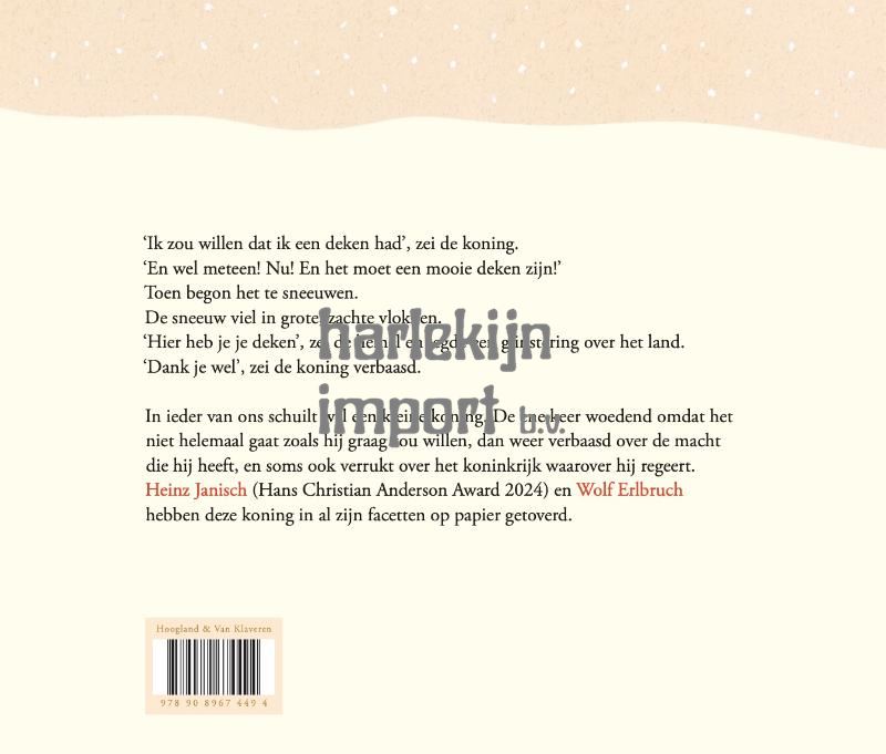 ‘Ik zou willen dat ik een deken had’, zei de koning. ‘En wel meteen! Nu! En het moet een mooie deken zijn!’ Toen begon het te sneeuwen. De sneeuw viel in grote, zachte vlokken. ‘Hier heb je je deken’, zei de hemel en legde een glinstering over het land. ‘Dank je wel’, zei de koning verbaasd. In ieder van ons schuilt wel een kleine koning. De ene keer woedend omdat het niet helemaal gaat zoals hij graag zou willen, dan weer verbaasd over de macht die hij heeft, en soms ook verrukt over het koninkrijk waarover hij regeert. Heinz Janisch (Hans Christian Anderson Award 2024) en Wolf Erlbruch hebben deze koning in al zijn facetten op papier getoverd.