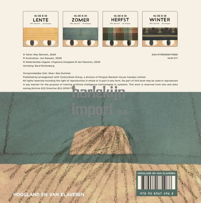 ‘Nu zie ik de zomer’ is onderdeel van een vierdelige reeks kartonboeken van het veelbekroonde duo Mac Barnett en Jon Klassen. Zij tonen ons de seizoenen door de ogen van een kind. Aan de hand van een spaarzame, ritmische tekst en sfeervolle, minimalistische illustraties neemt elk deeltje de jonge lezer mee naar dezelfde landelijke omgeving – het huis, de boom, de tuin en het kind zelf – terwijl de sfeer van de tekeningen met de seizoenen mee verandert. In ‘Nu zie ik de zomer’ staat de boom vol in het blad, we zien een stralend blauwe lucht, een verkoelend ijsje en een hoed als bescherming tegen de zon. Dit is het ideale kartonboek om samen de zomer te ontdekken. Want dat is toch de leukste tijd van het jaar!