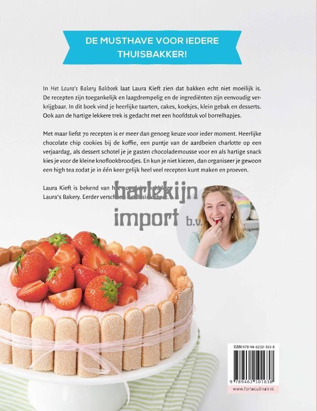 70 nieuwe bakrecepten van Laura’s Bakery, ook voor de hartige trek Na het geweldige succes van Het Basisbakboek komt Laura Kieft, de baking queen van Nederland, nu met een nieuw bakboek. In Het Laura's Bakery Bakboek laat ze zien dat je door de verhoudingen van ingrediënten aan te passen, iedere keer weer een compleet andere baksel op tafel kunt zetten. De recepten zijn toegankelijk en laagdrempelig en de ingrediënten zijn eenvoudig verkrijgbaar. Zo wordt bakken wel heel makkelijk en lekker! In dit boek staan heerlijke taarten, cakes, koekjes, klein gebak en desserts. Ook aan de hartige lekkere trek is gedacht met een hoofdstuk vol borrelhapjes. Met maar liefst 70 recepten is er meer dan genoeg keuze voor ieder moment. Heerlijke chocolate chip cookies bij de koffie, een puntje van de aardbeien charlotte op een verjaardag, als dessert schotel je je gasten chocolademousse voor en als hartige snack kies je voor de kleine knoflookbroodjes. En kun je niet kiezen, dan organiseer je gewoon een high tea zodat je in één keer gelijk heel veel recepten kunt maken en proeven. Laura Kieft is bekend van het populaire bakblog Laura’s Bakery met meer dan een miljoen unieke bezoekers per maand. Laura maakte intussen vier bakboeken bij Forte Culinair: na het Basisbakboek en dit Bakboek maakte ze Het Borrelhapjes Bakboek en Het Laura’s Bakery Kinderbakboek.