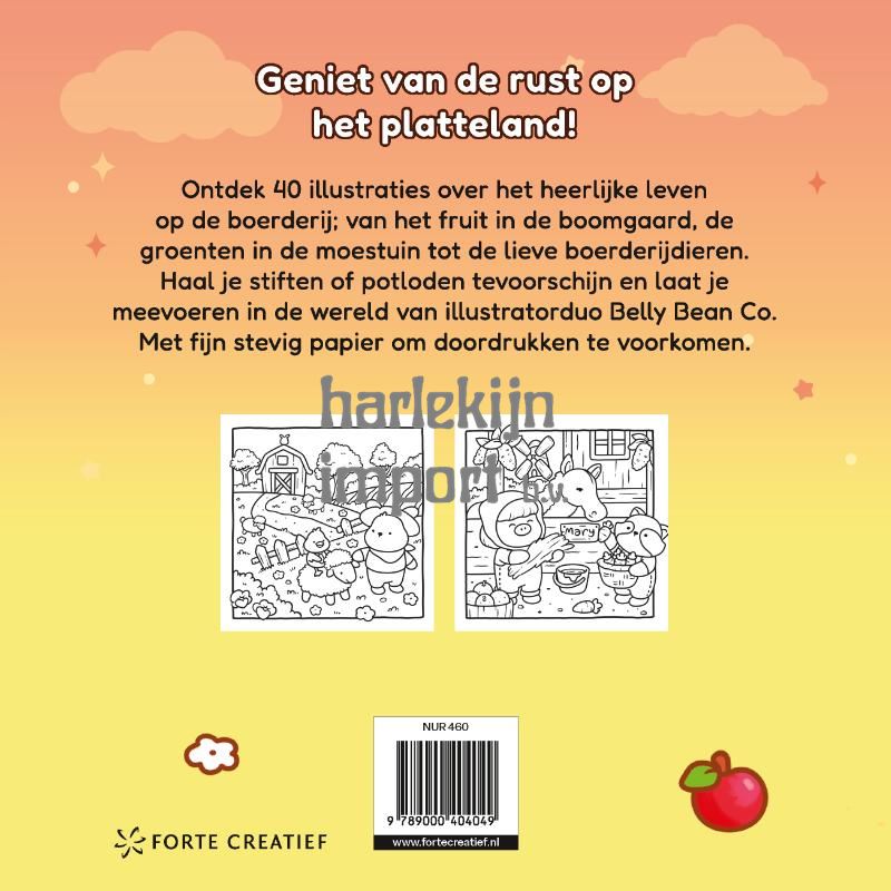 Hét kleurboek met extra dik papier – comfy kleuren op het platteland met de cozy tekeningen van illustratorduo Belly Bean Co. Toe aan een ontspannen moment? Droom even weg bij maar liefst 40 lieve en knusse tekeningen; van het fruit in de boomgaard, de groenten in de moestuin tot de lieve boerderijdieren. Haal je stiften of potloden tevoorschijn en laat je in dit kleurboek meevoeren in de wereld van illustratorduo Belly Bean Co. Met fijn stevig papier om doordrukken te voorkomen. In welke stemming je ook bent, er is een kleurboek voor iedereen! Ook in deze serie: Cozy & cute in het atelier en Cozy & cute in de bakkerij. Belly Bean Co. is een gepassioneerd duo illustrators. In al hun ontwerpen stoppen zij vrolijkheid en creativiteit. In hun kleurboeken staat op elke pagina niet zomaar een tekening, maar een verhaal dat er op wacht om te worden ingekleurd.