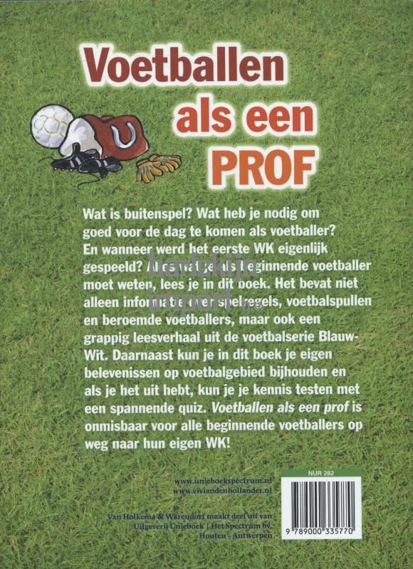 Voetballen als een prof: alles wat je moet weten om een topvoetballer te worden In dit boek van Vivian den Hollander staat alles wat je als beginnende voetballer moet weten over je favoriete sport. Het bevat niet alleen informatie over spelregels, voetbaluitrustingen en de geschiedenis van de sport, maar ook een spannend verhaal uit de populaire serie Blauw-Wit. Daarnaast kun je in dit boek voetbalkennis testen door middel van een leuke quiz en staan er leuke raadsels en spellen in over voetbal. Onmisbaar voor alle beginnende voetballers op weg naar hun eigen WK! Vol actie, weetjes en spelletjes, met illustraties van Saskia Halfmouw, de ultieme voetbalboekenillustrator!