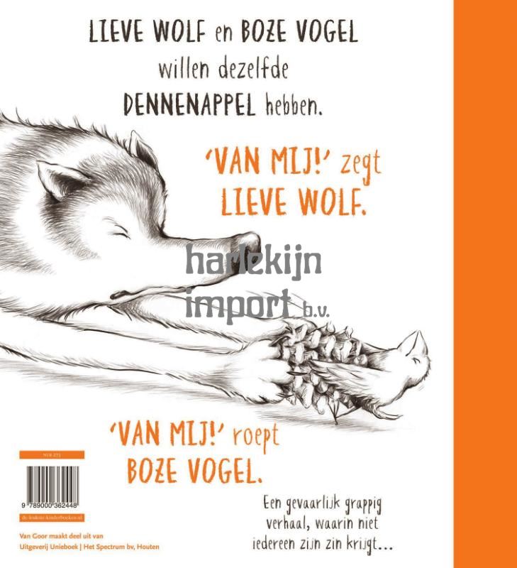 <h1><em>Van mij!</em></h1> <h2>Ondeugend prentenboek vol prachtige potloodtekeningen</h2> <p>Krik… Krak… Hop! Er valt een dennenappel op de grond. Wolf is erg blij met dit onverwachte speeltje… tot Vogel het van hem steelt. Maar wie niet kan vliegen, moet slim zijn en met een beetje snel denken, weet Wolf niet alleen zijn dennenappel terug te krijgen…</p> <p>• Herkenbaar thema voor alle kinderen <br />• Bijzonder originele illustraties<br />• Met grappige twist in het verhaal, waar kinderen – met Wolf! – van zullen smullen <br />• Vertaald door Tjibbe Veldkamp  </p>