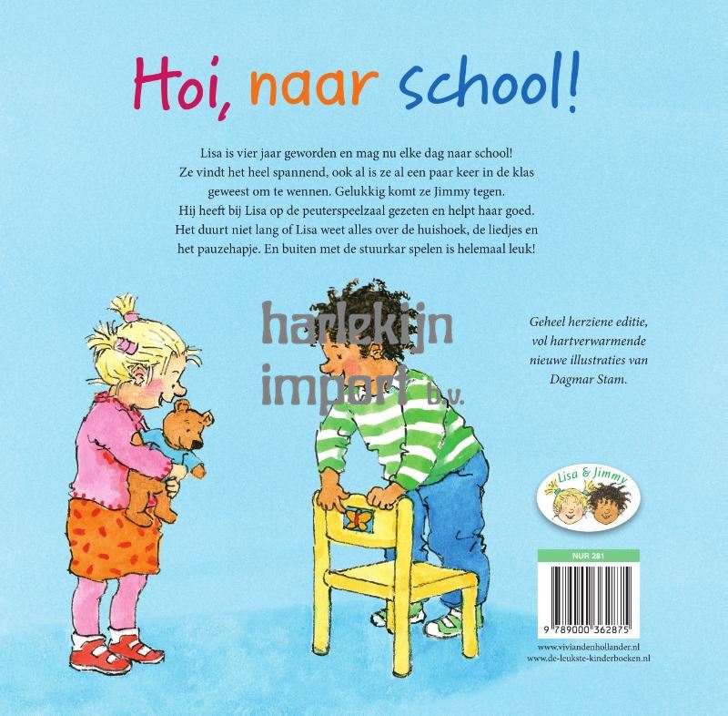 Lisa is vier jaar geworden en gaat voor het eerst naar school! Ze vindt het heel spannend, maar gelukkig komt ze Jimmy tegen. Hij heeft bij Lisa op de peuterspeelzaal gezeten en helpt haar goed. Het duurt niet lang of Lisa weet alles over de huishoek, de liedjes en het pauzehapje. En buiten met de stuurkar spelen is helemaal leuk! Deze herziene editie past perfect bij het onderwijs anno 2018! Met hartverwarmende nieuwe illustraties van Dagmar Stam.