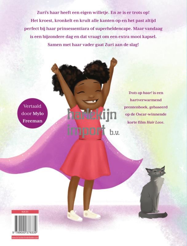 Zuri’s haar heeft een eigen wil en er is niets wat het niet kan. Het kan krullen of juist in allemaal kleine vlechtjes gevlochten worden. En als het regent, heeft het zelfs magische krachten! Zuri’s vader vindt haar haar fantastisch en daar is ze erg trots op. Maar ze heeft wel een beetje hulp van hem nodig om als een ster voor de dag te komen op een speciale dag. Dat is nog een hele uitdaging, maar er is niets wat Zuri en haar vader niet kunnen! Trots op haar! is een ontroerend en actueel voorleesverhaal om samen met je kind te lezen, te bekijken en erover te praten.