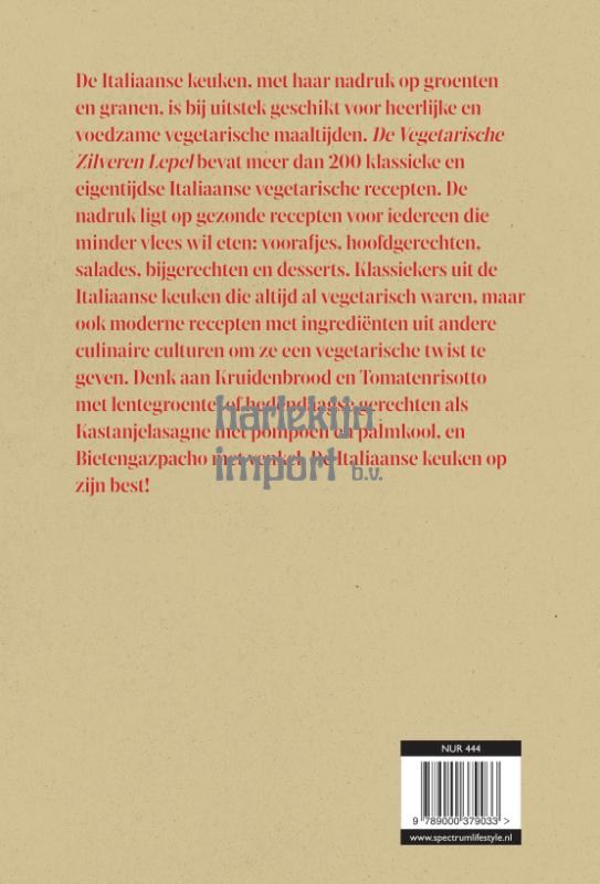 De Italiaanse keuken, met haar nadruk op groenten en granen, is bij uitstek geschikt voor heerlijke en voedzame vegetarische maaltijden. De Vegetarische Zilveren Lepel bevat meer dan 200 klassieke en eigentijdse Italiaanse vegetarische recepten. De nadruk ligt op gezonde recepten voor iedereen die minder vlees wil eten: voorafjes, hoofdgerechten, salades, bijgerechten en desserts. Klassiekers uit de Italiaanse keuken die altijd al vegetarisch waren, maar ook moderne recepten met ingrediƫnten uit andere culinaire culturen om ze een vegetarische twist te geven. Denk aan Kruidenbrood en Tomatenrisotto met lentegroente, of hedendaagse gerechten als Kastanjelasagne met pompoen en palmkool, en Bietengazpacho met venkel. De Italiaanse keuken op zijn best!