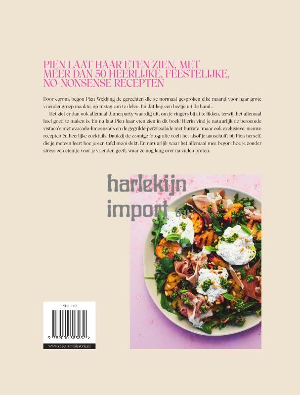 Maak van elke dag een dinner party met deze culinaire bestseller van Pien laat haar eten zien en Pien laat haar eten zien vol. 2 zijn samen al meer dan 72.500 exemplaren verkocht! Door corona begon Pien Wekking de gerechten die ze normaal gesproken elke maand voor haar vriendengroep maakte, op Instagram te delen. En dat liep een beetje uit de hand... Die gerechten zien er dan ook stuk voor stuk dinner party-waardig en om je vingers bij af te likken uit. Tegelijkertijd zijn de meer dan vijftig recepten no-nonsense en heel goed te doen. En dus laat Pien haar eten zien in deze must-have! Hierin vind je natuurlijk de beroemde vistaco’s met avocado-limoensaus en de gegrilde-perziksalade met burrata, maar ook exclusieve, nieuwe recepten én heerlijke cocktails. Dankzij de zonnige fotografie, sfeervolle storytelling en mooie vormgeving voelt het alsof je aanschuift bij Pien herself, die je meteen leert hoe je de tafel mooi dekt, en natuurlijk waar het allemaal mee begon: hoe je zonder stress een etentje voor je vrienden verzorgt waar ze nog lang over na zullen praten. 'Sharing is caring. Eigenlijk in de eerste plaats voor Piens vrienden maar gelukkig gunde ze de wereld haar recepten. Zo lekker en tasty, vooral als je wat te vieren hebt!' Rens Kroes De liefde voor koken en eten is Pien Wekking met de paplepel ingegoten. En dus was zij altijd degene die heerlijke etentjes voor haar vrienden organiseerde. Maar door corona werd ze gedwongen haar recepten via Instagram te delen. Ondertussen is ‘zullen we vanavond Pienen’ een gevleugelde uitdrukking in vele (studenten)huishoudens. Pien woont in Amsterdam, waar ze Informatierecht studeert.