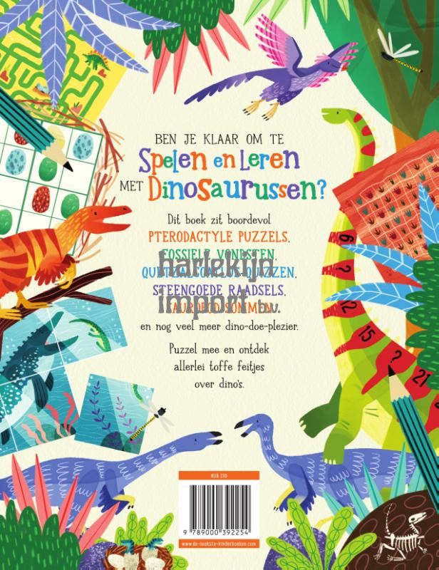 Uren puzzelplezier met het dikke dino-doeboek! Voor alle kleine dino-fans is er eindelijk een dik doeboek vol kleurrijke dinosaurusspelletjes om je urenlang in te begraven! Het dino-doeboek zit boordevol prehistorische puzzels, fossiele vondsten, steengoede raadsels en ijscoole tekeningen. Doe de quetzalcoatlus-quiz, vergelijk de triceratops-schedels, maak de sauropod-sommen of graaf naar dino-fossielen. Met onder meer doolhoven, zoek-de-verschillen, woordzoekers, raadsels, zoekplaatjes en sudoku’s. Duik in de wereld van de dino’s en leer alles wat je nog niet wist over de velociraptor, de tyrannosaurus rex, de triceratops en de stegosaurus. Dit boek barst van de prehistorische pret met maar liefst 80 puzzels! Een perfect vakantieboek voor dino-fans vanaf 5 jaar.